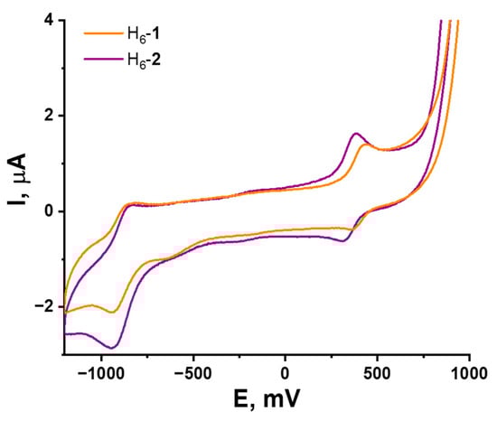 Cyclic voltammetry of H6-1 and H6-2 (0.5 mM) in 0.1 M Bu4NClO4 DMSO solution; scan rate—100 mV/s. Reference electrode: Ag/AgCl/3.5 M KCl.