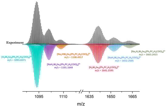 Furthermore, according to high-resolution mass spectrometry, water solutions of Na6-1 and Na6-2 contain cluster forms with six ligands and various cationic compositions (Figure 4 and Figure S11, Supplementary Materials), additionally indicating the existence of clusters in aqueous solutions.