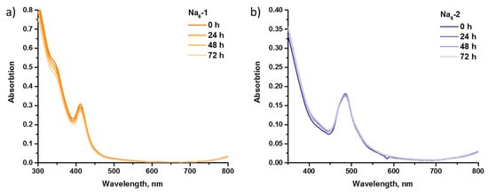 UV–Vis spectra of Na6-1 (a) and Na6-2 (b) in time in culture medium.