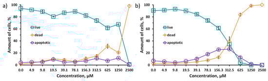 Viability of Hep-2 cells treated with Na6-1 (a) and for Na6-2 (b), determined by double-staining with Hoechst 33342/PI.