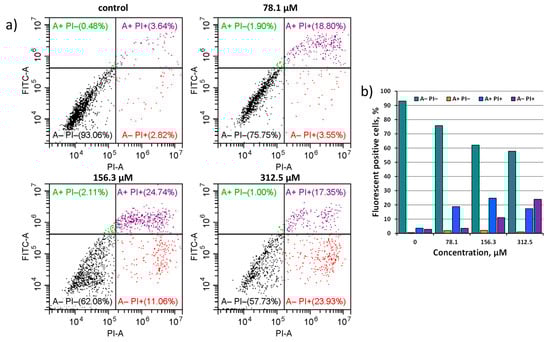 To confirm that Na6-2 is able to initiate the apoptosis of tumor cells, an additional study was conducted. Hep-2 cells were incubated with Na6-2 at concentrations of 78.1, 156.3, and 312.5 μM and stained with fluorescein isothiocyanate (FITC) conjugated with Annexin V and propidium iodide (PI). PI enters the cell if the cellular membrane is disrupted, binds to the DNA, and becomes intensely fluorescent, indicating necrosis. Annexin V binds to phosphatidylserine, which is a marker of apoptosis on the plasma membrane’s outer layer. Thus, cells stained only with Annexin V indicate an early stage of apoptosis, while a double-positive signal shows late apoptosis.