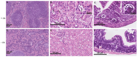 Analysis of the intestines of cisplatin-treated mice (Figure 1C) revealed numerous apoptotic bodies in the epithelial cells (enterocytes) and necrotic epithelial cells, particularly in crypts. The lamina propria showed few neutrophilic granulocytes. Other layers of the intestinal wall, including the peritoneum, were normal.
