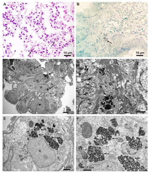 Representative micrographs of MSCs with internalized CoFe2O4. (A) Light micrograph of hematoxylin and eosin staining showing scattered cells containing brown particles inside the cytoplasm (arrows). (B) Micrograph of a semi-thin section stained with Azure II. Note the cell full of brown particles inside the cytoplasm (arrow). (C) TEM micrograph of three MSCs (arrows) containing electron-dense NPs in endosomes in the lungs of control mouse. Scale bar: 2 µm. (D) TEM micrograph of two MSCs (arrows) containing electron-dense NPs in endosomes in the spleen of cisplatin-treated mouse. Scale bar: 2 µm. (E) TEM micrograph of MSC containing electron-dense NPs in numerous endosomes (arrows) in the lungs of cisplatin−treated mouse. Scale bar: 1 µm. (F) Higher magnification of endosomes (from (E)) fully loaded with electron−dense NPs (arrows). Scale bar: 0.5 µm. Legend: n−nucleus.