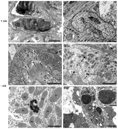 Representative TEM micrographs of intracellular localization of electron−dense NPs in the kidney and intestine of cisplatin-treated mouse (+cis) (A,B) and in the kidney and liver of control mouse (−cis) (C–F). (A) Electron-dense NPs (arrow) in endosome of MSC located in interstitium between peritubular capillary and tubular basement membrane. Scale bar: 2 µm. (B) Three endosomes containing electron−dense NPs (arrows) inside the cytoplasm of MSC in intestine. Scale bar: 2 µm. (C) Several small endosomes with electron-dense NPs (arrows) in apical cytoplasm of proximal tubular epithelial cells. Scale bar: 10 µm. (D) Endosomes with electron-dense NPs (arrows) in basal and apical cytoplasm of proximal tubular epithelial cell. Scale bar: 5 µm. (E) Higher magnification of endosome containing NPs (arrow) in proximal tubular epithelial cell. Scale bar: 1 µm. (F) Electron-dense NPs in endosomes (arrows) of Kupffer cell. Scale bar: 2 µm. Note a high magnification view of large endosome fully loaded with electron-dense NPs in the upper right corner of the figure. Scale bar: 1 µm. Legend: n−nucleus; c−cytoplasm of neutrophilic granulocyte; L−lumen of proximal tubule; m−mitochondria.