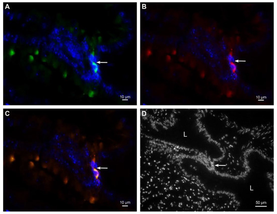 Representative images of immunofluorescent labeling against CD44 and CD105 in lungs. Two MSCs with positive immunoreaction against CD44 (green fluorescence) (A) and CD105 (red fluorescence) (B). The same two MSCs are orange−colored due to merged green fluorescence of CD44 and red fluorescence of CD105 confirming the colocalization of both surface markers (C). MSCs were located in the interstitium between alveoli ((D) nuclear staining only). Nuclei are stained with DAPI. Arrow denotes two MSCs. L−lumen of the alveolus.