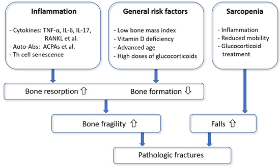 In summary, we proposed the following model of the pathophysiology of osteoporosis in RA (Figure 2). The autoimmune inflammatory processes lead to a systemic upregulation of inflammatory and osteoclastogenic cytokines (in particular RANKL and TNF-α), the production of autoantibodies and Th cell senescence with a presumed disability to control the systemic immunological and osteoclastogenic status. Consequently, osteoclast activity increases, osteoblast function decreases, and bone metabolic and mechanical properties deteriorate. General risk factors of osteoporosis (such as advanced age or vitamin D deficiency) may further contribute to bone fragility. Sarcopenia in RA is a cause of falls and their potential consequence, fractures.