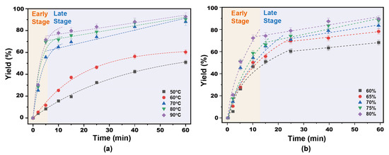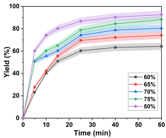 The apparent kinetics of the separation of lignin is influenced by mass transfer processes. Major factors include reaction temperature, pH and degree of mixing [32]. Figure 1 shows the isolated yield of lignin as a function of time at different p-TsOH concentrations. The separation of lignin can be divided into two main phases: fast separation and slow separation. First, after 25 min, the separation yield of lignin changed when the concentration of p-TsOH was 60% and 65%. In fact, the single yields of lignin increased rapidly to 60.27% and 69.55%, respectively. Then, the rate of lignin separation decreased, and after 60 min, the yields were 60.27% and 74.18%, respectively. This was attributed to residual lignin in the intercellular layer, which is more difficult to remove [8]. It is difficult to obtain an efficient reaction with p-TsOH. The isolated yields of lignin rapidly increased to 55.64% and 60.27% in the first 5 min with acid concentrations of 70% and 75%. The growth rate was then slow between 5 and 15 min. However, it increased rapidly between 15 and 25 min and leveled off after 25 min. This was attributed to the increase of p-TsOH molecular concentration in solution with the acid concentration. Mass transfer kinetics were enhanced due to the large concentration difference between the two sides of the cell wall. However, the polymerization of dissolved lignin was promoted. p-TsOH was consumed in the reaction with condensed lignin and, after the condensed lignin was completely consumed, it continued to react with other unreacted bagasse lignin. In addition, the separation yield of lignin rapidly increased to 60.27% at 80% acid concentration in the first 5 min. Then, it slowly increased to 92.63%, thus remaining almost unchanged. This was attributed to the speed of the fast reaction phase, which was much greater than that of the slow reaction stage. The results showed that both the surface reaction process and the outward diffusion of degradation products from the cell wall were affected by the acid concentration. However, previous studies found that carbohydrates were severely degraded in the presence of 90% p-TsOH [33]. Therefore, a concentration of 80% of p-TsOH was used to study the separation kinetics of lignin.
