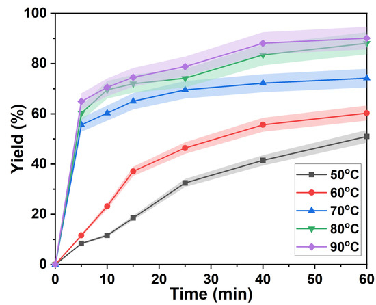 As shown in Figure 2, the lignin rapid separation stage was shortened from 25 min to 10 min when the temperature was increased from 50 °C to 60 °C. At the same time, the separation yield of lignin in the rapid separation stage also increased from 32.46% after 25 min to 64.91% after 5 min. This was due to the increase of the reaction rate with the temperature. The time of the slow delignification stage of p-TsOH gradually shortened with an increasing temperature. The isolated yield of lignin gradually increased with time at 80 °C and 90 °C. However, a second rapid increase was found after 25 min. Finally, the separation yields of lignin were 88.09% and 90.14%, respectively. This was attributed to the condensation of lignin and the attachment of carbohydrates to lignin [34], which became the main controlling step in the later stage of the lignin separation reaction. However, polycondensation of lignin is inevitable at high temperatures and results in a suppressed rate of lignin separation [35].