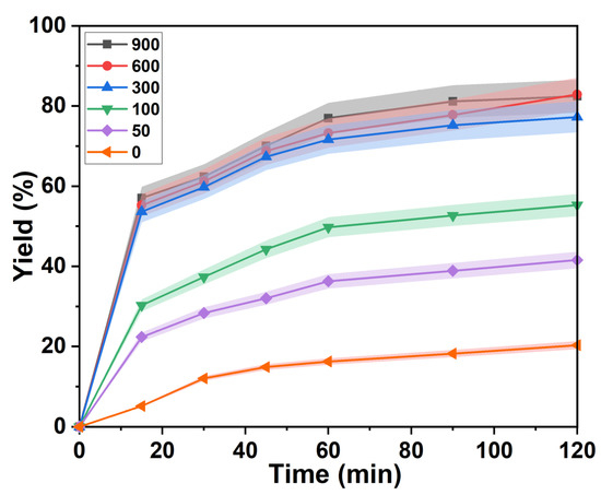 The effect of agitation rate on the yield of lignin separation was investigated in the p-TsOH treatment process shown in Figure 3. The reaction proceeded slowly at zero stirring speed. The isolated yield of lignin was 12.52% in 30 min. Then, the variation of the lignin separation yields flattened. It was 17.58% at 120 min. The overall delignification was maintained at a low level. This is attributed to the uneven mixing of bagasse and p-TsOH solution. The contact of H3O+ in solution with unreacted moieties is hindered [33]. Obviously, the degree of separation of lignin was improved by increasing the stirring speed. The separation yield of lignin was 54.50% at 15 min when the stirring speed was increased to 300 rpm. It increased to 72.64% at 120 min. However, a significant improvement in the separation yield of lignin is difficult to achieve by continuing to increase the rotational speed. The lignin separation yield was almost equal to 300 rpm when the stirring speed reached 900 rpm. Therefore, uniform mixing of the reactants was achieved when the stirring speed reached 300 rpm. The isolated yield of lignin remained unchanged by further increasing the stirring speed. This means that a dynamic equilibrium of the reaction is obtained.