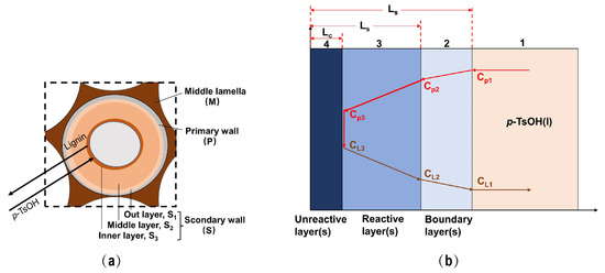 Plant cell walls are usually structurally complex, as shown in Figure 4a. From the outside to the inside, there are, respectively, a primary wall and a secondary wall. The secondary wall further comprises an outer layer, a middle layer and an inner layer, of which the middle layer is the thickest [36]. The process of separating lignin from p-TsOH involves the transfer of p-TsOH from the intercellular layer to the primary wall and finally to the secondary wall, while dissolved lignin moves from the secondary wall to the primary wall and finally dissolves from the intercellular layer. Because the lignin and hemicellulose of the cell wall are dissolved in the reaction cycle, the unreacted layer is gradually compressed. Therefore, the separation of lignin by p-TsOH fits the reduced core model [25]. In this study, the slab shrinkage model proposed by Zhao et al. [32] was considered to better understand the p-TsOH-based delignification process. The bagasse cell wall can be simplified into a flat plate. The details are shown in Figure 4b.