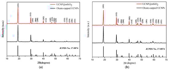X-ray diffraction (XRD) analysis was used to clarify the phase structures of both Ho3+-doped and Er3+-doped oleate-capped core/shell UCNPs and mesoporous silica-coated UCNPs. As regards both mSiO2-coated UCNPs, the XRD patterns shown in Figure 1a,b are similar to those of oleate-capped UCNPs, which are indexed as the standard data (JCPDS No. 17-0874) of the tetragonal LiYF4 crystal. It is obvious that the coating of a thin layer mesoporous silica did not affect the crystal structure of the synthesized UCNPs. It should be noted that the WAXD diffractograms of both ligand-free UCNPs are omitted here due to the fact that they have the identical structures with those of oleate-capped UCNPs [].