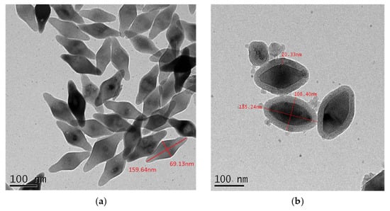 TEM images of LiYF4:Yb3+0.25,Er3+0.01@LiYF4:Yb3+0.2 UCNPs. (a) Ligand-free nanoparticles; (b) mSiO2-coated nanoparticles.