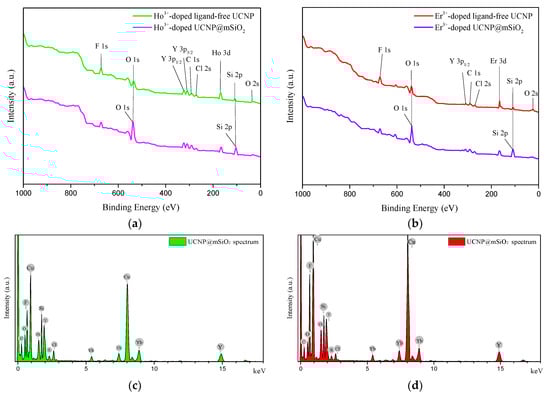 XPS spectra of (a) ligand-free and mSiO2-coated LiYF4:Yb3+0.25,Ho3+0.01@LiYF4:Yb3+0.2 nanoparticles and (b) ligand-free and mSiO2-coated LiYF4:Yb3+0.25,Er3+0.01@LiYF4:Yb3+0.2 nanoparticles. EDS spectra of (c) mSiO2-coated LiYF4:Yb3+0.25,Ho3+0.01@LiYF4:Yb3+0.2 nanoparticles and (d) mSiO2-coated LiYF4:Yb3+0.25,Er3+0.01@LiYF4:Yb3+0.2 nanoparticles.