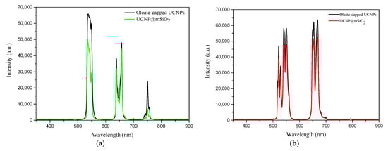 PL spectra of (a) oleate-capped and mSiO2-coated LiYF4: Yb3+0.25/Ho3+0.01 @ LiYF4:Yb3+0.2 and (b) oleate-capped and mSiO2-coated LiYF4: Yb3+0.25/Er3+0.01 @ LiYF4:Yb3+0.2 UCNPs under 980 nm NIR irradiation.