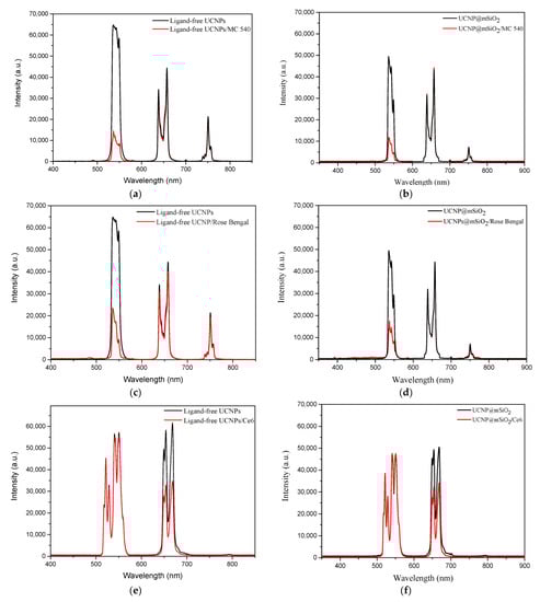 PL spectra of nanoparticles under 980 nm NIR excitation before and after adsorption of PS molecules. (a) Ligand-free, and; (b) mSiO2-coated LiYF4: Yb3+0.25/Ho3+0.01 @ LiYF4:Yb3+0.2 with MC 540; (c) ligand-free, and; (d) mSiO2-coated LiYF4: Yb3+0.25/Ho3+0.01 @ LiYF4:Yb3+0.2 with rose bengal; (e) ligand-free, and; (f) mSiO2-coated LiYF4: Yb3+0.25/Er3+0.01 @ LiYF4:Yb3+0.2 with Ce6.