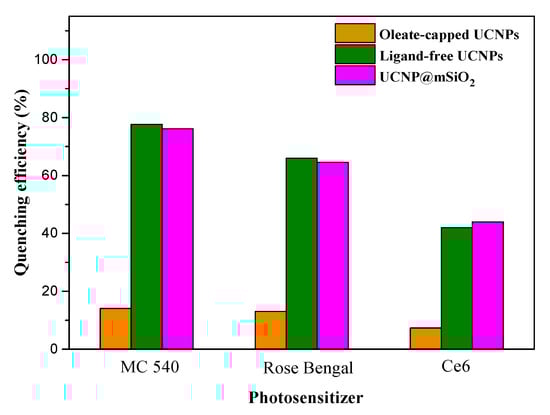Comparison of quenching efficiency of Ho3+-doped UCNP@mSiO2/MC 540 pair, Ho3+-doped UCNP@mSiO2/RB pair and Er3+-doped UCNP@mSiO2/Ce6 pair with their corresponding oleate-capped and ligand-free type adducts after the occurrence of FRET.