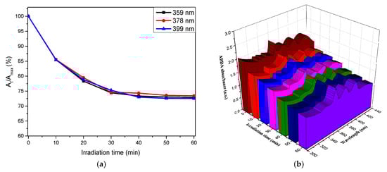 Under NIR exposure, the UV-vis absorbance change of Ho3+-doped UCNP@mSiO2/MC 540 donor-acceptor system (a) as a function of irradiation time and (b) as a function of irradiation time and absorption wavelength.