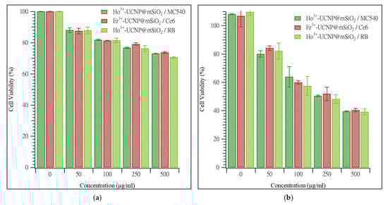 (a) Viability of MCF-7 cells incubated with UCNP@mSiO2/PS at different concentrations for 24 h without NIR exposure. (b) Viability of MCF-7 cells incubated with UCNP@mSiO2/PS at different concentrations for 24 h and irradiation with 980 nm for 5 min.