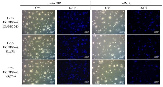 Optical and DAPI-stained images (from top to bottom) of Ho3+-UCNP@mSiO2/MC 540, Ho3+-UCNP@mSiO2/RB and Er3+-UCNP@mSiO2/Ce6 without (left) and with (right) NIR irradiation. All scale bars are in 100 μm.