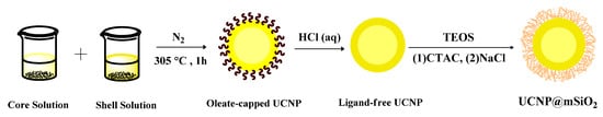 Synthetic route for the preparation of mSiO2-coated UCNP.