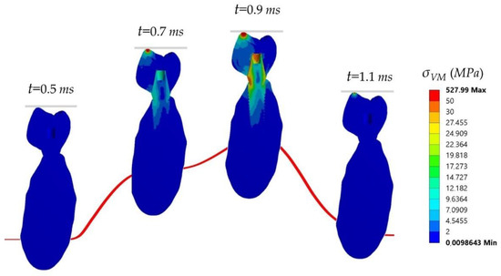 The stress distribution varied over time, reaching the maximum stress values during the impact. Due to the impact eccentricity, the crown and the implant started bending around the z-axis, and some oscillations occurred. As mentioned previously, there was a singular point at the highest crown cusp; therefore, the values obtained at that zone were not representative. Figure 1 shows the stress evolution at the significant time instants in the cross-section of one of the carbon fiber ceramic crown (FCCER) model.
