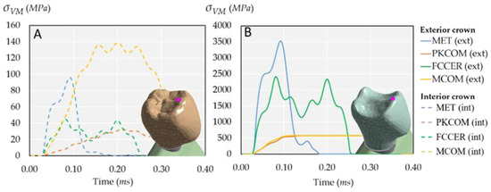 Von Mises stress at the selected nodes in both internal and external parts of the crown for the common materials: MET, PKCOM, FCCER, and MCOM. (A) Interior crown. (B) Exterior crown.