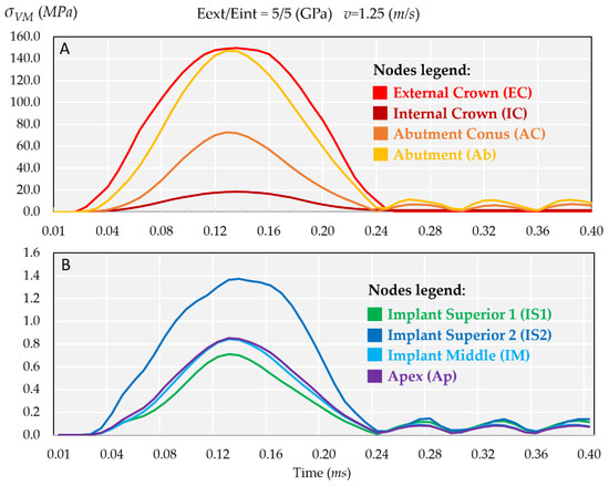 The stress evolution was displayed in two figures because of the large difference in stress values, ranging from 150 MPa to 0.7 MPa. As expected, the highest stresses were at the external crown (EC), 150 MPa, while the lower stresses were registered at the internal crown (IC) as 20 MPa, as shown in Figure 3A. Regarding the lower four nodes, there was a large difference between IS1 and Ap nodes (Figure 3B) because the impact force was gradually balanced along the implant length from IS2 node until the end of the implant.
