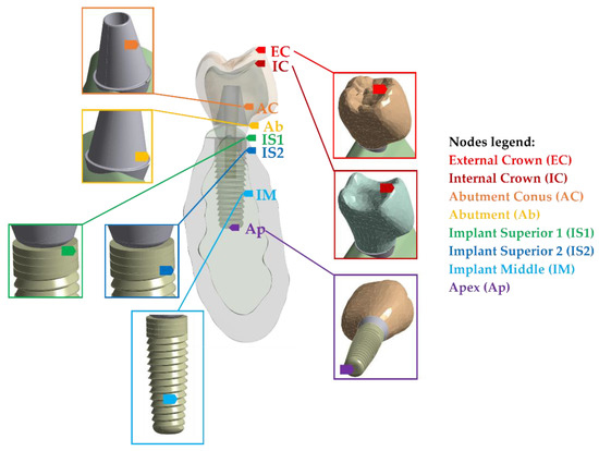 In a dynamic analysis, instead of stationary forces set as boundary conditions, the impact conditions are set up in terms of initial displacements, velocities, or accelerations of an object. The simulation end-time also has to be set. The chewing impact occurs in a very short period of time. Some previous works in other scientific fields found that the impact lasts less than one millisecond [32]. On the one hand, the duration of the simulations should be as short as possible to reduce the CPU computation time; but on the other hand, it should be longer than the impact duration and its further effects. Finally, the simulation end-time was set at 0.4 ms, corresponding to the total duration of the transient. The number of substeps, or time-step, has to be fixed, where substeps is the number of halfway calculations to change from a geometry to the next one. A value of 53 substeps, i.e., a time-step of 7.55 µs, was found to be reasonable. Selected nodes are displayed and identified in Figure 4.