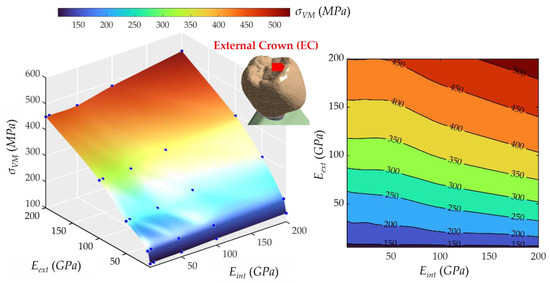 Figure 5 shows that the external crown behavior was similar to the apex; although it was more proportional to the Eext, the stress ranged from 113.39 MPa to 527.21 MPa. Indeed, the higher the stiffness, the higher the stress response, following a linear law. Moreover, the effect of the Eint was negligible. The maximum value also occurred in the case of the most rigid crowns.