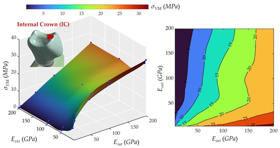 Figure 6 shows that the Eint influence on stresses at the internal part of the crown was also proportional. However, the Eext slightly affected the stress, contrary to the Eint, so the more rigid the external crown, the lower stress at the internal crown. The stress varied from 0.67 to 32.52 MPa, and the peak occurred at the combination of the most rigid internal part of the crown and the softest external part of the crown. Additionally, it can be seen that a remarkable effect occurred in the range from 0 to 50 GPa of the external crown.