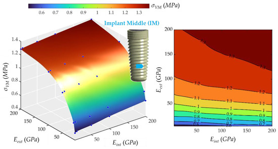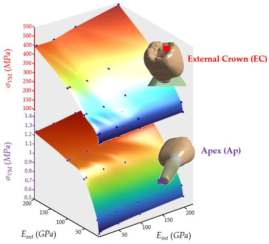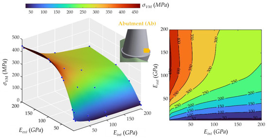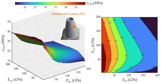From the surface response plots of the maximum stress, it is evident that there was a direct correlation between the Young’s modulus of the crown materials and the stresses on almost all parts of the dental implant, following a similar pattern. It should be emphasized that this difference was remarkable at the crowns. However, its effect was not always the same. The relationship was linear in the apex, the external and internal parts of the crowns, and the implant, but, in the abutment base, the maximum stress occurred at the lowest values of Eint and medium values of Eext.