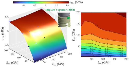 Figure 12 shows how the Young’s modulus of external and internal crowns affected the maximum stress in the apex. It can be noted that stresses increased steadily from 0.53 MPa to 1.33 MPa when increasing Eext. In contrast, Eint did not significantly change the stress. The peak occurred in the case of the most rigid crowns. The behavior of σVM was very similar to that of implant superior 1 (IS1) and implant middle (IM), with a decisive influence of Eext and very little of Eint.