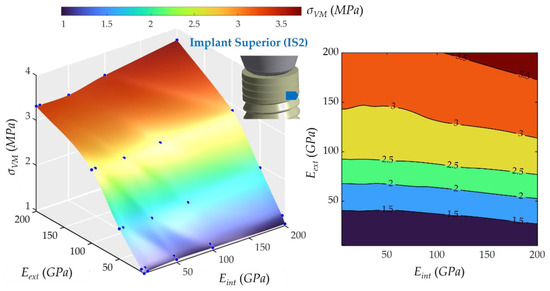The same behavior was found in the second upper part of the implant (see Figure 10). The lowest stress was 0.97 MPa, and the highest was 3.72 MPa. The Eext had a decisive influence, and the Eint practically did not affect the value of σVM. However, the σVM increased more than in the IS1 for similar values of Eext.