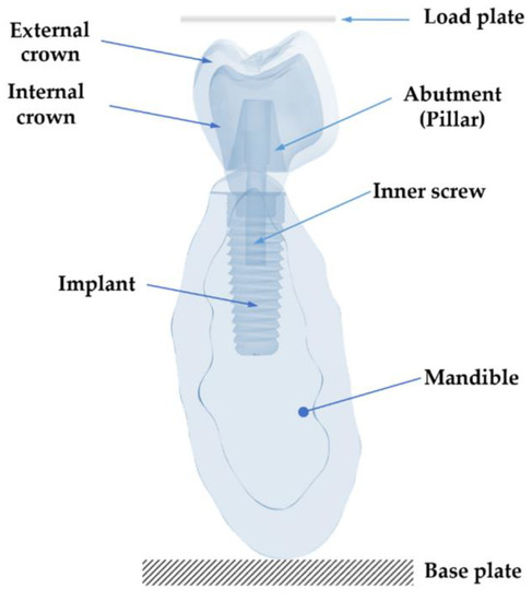 The endosseous implant used in this study is sized 4.2 × 11.5 mm [25]. The implant was modeled in Solidworks CAD software v2022 R2 [23]. The whole studied system consists of the following components: crowns, the inner screw, the abutment, the implant, and the load plate (see Figure 14). All the parts of the model are described hereafter. Ethics approval was not required for this in vitro study.