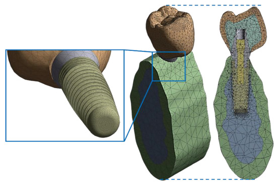 - Medina-Galvez, R.; Canto-Naves, O.; Marimon, X.; Cerrolaza, M.; Ferrer, M.; Cabratosa-Termes, J. Bone Stress Evaluation with and without Cortical Bone Using Several Dental Restorative Materials Subjected to Impact Load: A Fully 3D Transient Finite-Element Study. Materials 2021, 14, 5801. [Google Scholar] [CrossRef]
