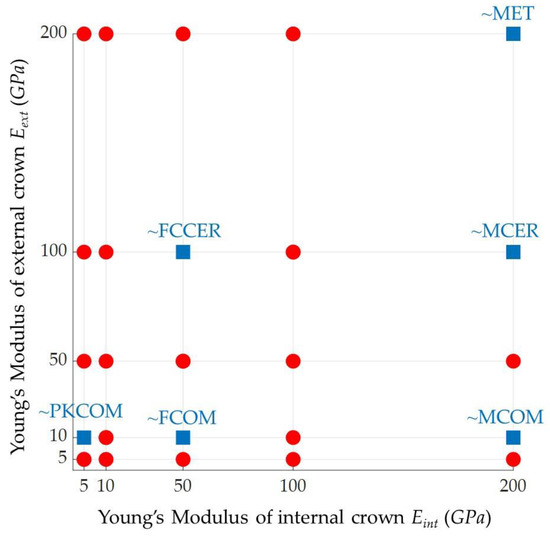 - External crown’s Young’s modulus (Eext). According to the mechanical properties listed in Table 1 and Table 2, the external crown Young’s modulus varied from 200 GPa (MET) to 8.43 GPa (MCOM, FCOM, and PKCOM) but was not equally spaced between the models. Then, discrete values for this parameter were set to 10, 50, 100, and 200 GPa.