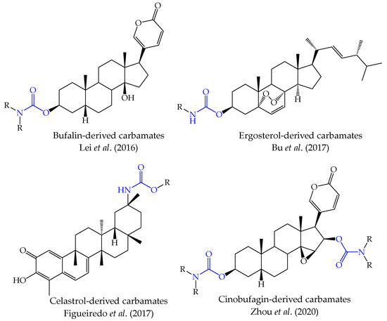In addition to Taxol, which is a widely used anticancer drug [23], a series of steroidal carbamates have recently been synthesized, and their anticancer, cytotoxic, and antitumor properties have been evaluated [24,25,26,27] (Figure 2).