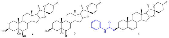 Synthesis of diosgenin derivatives 2 and 3 (Figure 3) have been previously reported [33]. Briefly, a diosgenin double bond is epoxidized, followed by enantioselective opening of the obtained epoxides, and regioselective oxidation of the axial -OH group at C6. On the other hand, synthesis of carbamate 4 was performed by reacting diosgenin with phenyl isocyanate under Brønsted acid catalysis.