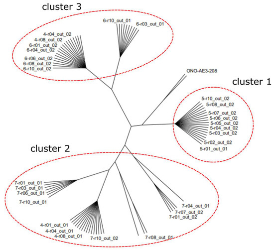 Afterwards, docking results were evaluated by performing automatic analysis of poses using self-organizing maps (AuPosSOM). Ligands are clustered by considering the similarity of their poses contact footprint with the EP4 receptor, and a tree map showing contact footprint of all poses was obtained (Figure 5). For the sake of comparison, the footprint of a co-crystallized inhibitor (ONO-AE3-208) has also been included. As displayed in Figure 5, three major clusters were obtained, and the highest similarity with the ONO-AE3-208 binding mode corresponds to compound 5 (Cluster 1. Figure 5). Only binding modes 1 and 3 of compound 7 were considered for further analysis.