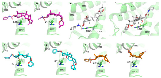 Binding modes of 4, 5, 6, and 7, are shown in Figure 6. Interestingly, in all poses except for 5 (2), the N-phenyl-carbamoyl moiety was oriented towards residues of the second transmembrane domain (TM2), while the steroid moiety was located between TM1 and TM7 with the α-face of steroidal rings near to TM7 (Figure 6A). On the other hand, in pose 5, (2) the N-phenyl-carbamoyl fragments were oriented towards TM1 and TM7 and the steroidal moiety was also placed towards TM2 (Figure 6D). It is remarkable that only 6 (1) kept two short-distance interactions (<2.5 Å) with carbons at γ and δ positions of R316 (Figure 6E,F), whereas 5 (2) formed a polar interaction with guanidine group of R316 at 2.4 Å. These interactions involved the proton from the 5-hydroxyl group, suggesting B-ring functionalization with polar groups could be a positive feature in establishing strong interactions with EP4. These results indicate that compound 6 should be the best EP4 antagonist, which is in line with the experimental data presented here.