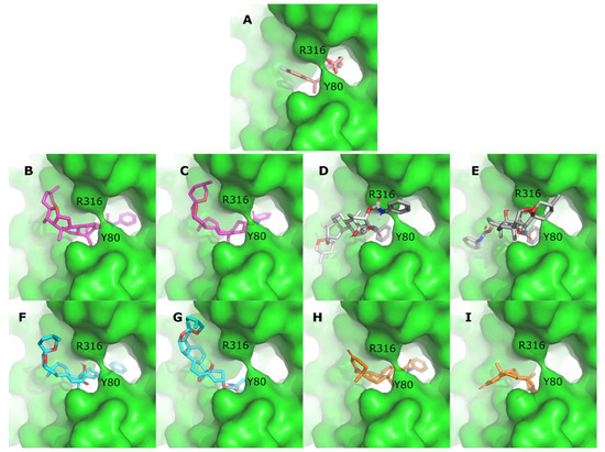 A contact-based analysis using BINANA was performed to obtain an insight into the kind and strength of ligand–receptor interactions (Table S1). As a general trend, only a few hydrogen bonds were found among the predicted conformations (Figure S4). Compounds 4 (2) and 7 (1) exhibited polar interactions with T76 at 2.4 and 2.5 Å, respectively, while 6 (1) formed a hydrogen bond (1.9 Å) with Y80. Interestingly, a polar interaction between R316 and the hydroxyl group bound to C5 on the steroidal core of compound 7 (2) was also observed. On the other hand, several van der Waals contacts (<4.0 Å) were identified, with the most recurrent involving T76, Y80, R316, and V320; the first three are crucial residues for ligand binding [27].