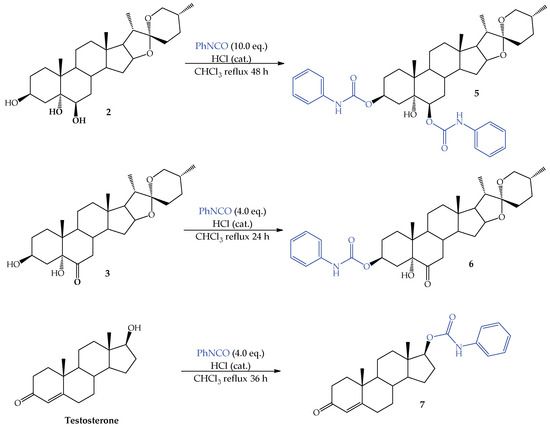 Using this reaction, three new carbamates were synthesized, namely diosgenin carbamates 5 and 6, and testosterone carbamate 7 (Scheme 1). Conditions for condensation reactions between hydroxysteroids and phenyl isocyanate under hydrochloric acid catalysis are shown in Scheme 1.