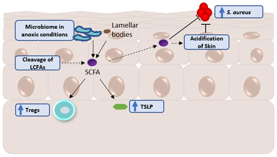 Diagram of shorter-chain free fatty acids (SCFA) within atopic eczema. Free fatty acids are produced from the breakdown of the lamellar bodies [81,82], and the lysis of the skin’s proteins and sebum by Cutibacterium acnes [83,84], and a select few are produced by the microbiome under anoxic conditions by the fermentation of carbohydrates [85,86,87,88,89]. These free fatty acids contribute to the acidification of the skin, which in healthy individuals is around 4.7 [90]. This acidification discourages S. aureus growth, and the production of SCFAs inhibit the other growth of pathogenic sub-strains [79]. Resident skin bacteria can also use the SCFAs to interact with the host’s immune system through inducing T regulator cells (Tregs)—by decreasing the transcription of il6—and TSLP [91,92,93,94]. Studies in other organs suggest that SCFAs can inhibit dendritic cells’ expression of lipopolysaccharide-induced cytokines (IL-6 and IL-12p40) [95] and activate macrophages, neutrophils, and monocytes through the G-protein-coupled receptor FFAR2 [96]. Although well studied in other organ systems, the SCFAs’ mode of action in the skin is still unclear. Symbol: ↑ (increase) and a dotted arrow (theoretical mechanism).