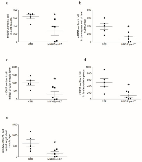 MtDNA depletion in the ileum of MNGIE patients. The figure reports the mtDNA content per cell in the different layers of the ileal wall of control subjects (black circles) vs. MNGIE patient (black squares) specimens. Specifically, the panels are representative of the comparison between controls and MNGIE. Data are reported as scatter plots of mtDNA copy/cell with average ± SD, respectively (a) in the mucosa, 630 ± 114 vs. 274 ± 247 (* p = 0.0159); (b) in the small vessel wall, 383 ± 90 vs. 101 ± 97 (* p = 0.0159); (c) in circular muscle layer, 1018 ± 338 vs. 320 ± 387 (* p = 0.0317); (d) in myenteric plexus areas, 521 ± 110 vs. 281 ± 116 (* p = 0.0317). No selection of cells present in the ganglion was made; thus, the values refer indistinctly to neuronal, glial, and interstitial cells of Cajal (ICC) which have been obtained from the unavoidable interface between smooth muscle and myenteric plexus; and (e) in longitudinal muscle 634 ± 165 vs. 377 ± 162 (* p = 0.0317).