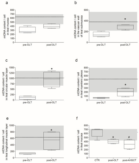 MNGIE patient mtDNA recovery after TP replacement therapy. Each panel (a–e) reports the mtDNA content per cell in the different layer of the ileal wall of the same patient pre- vs. post-LT. Data are reported as box and whiskers plot, with min to max, of mtDNA copy/cell. Each graph also reports the average of control value, indicated by the dotted line, with ± SD, represented by the grey area. Specifically, the comparison pre- vs. post- LT was performed (a) in the mucosa, 296.1 ± 78.3 vs. 399.4 ± 48.8 mtDNA copy/cell ± SD respectively; p = 0.2 n.s.; (b) in the submucosal small vessel wall, 147.3 ± 45.8 vs. 292.2 ± 45.7 mtDNA copy/cell ± SD respectively; * p = 0.0286; (c) in the circular muscular layer, 109.1 ± 79.2 vs. 954.0 ± 351.6 mtDNA copy/cell ± SD respectively; * p = 0.0286; (d) in the myenteric plexus, 56.7 ± 12.3 vs. 200.1 ± 99.6 mtDNA copy/cell ± SD respectively; * p = 0.0286; and (e) in the longitudinal muscular layer, 136.2 ± 22.4 vs. 533.7 ± 299.3 mtDNA copy/cell ± SD respectively; * p = 0.0286. Panel (f) is the representation of measurements obtained in the patient post-LT (reported in panel a) in comparison with a patient post-AHSCT (331.7 ± 112.0 mtDNA copy/cell ± SD) vs. control subjects (630 ± 114 mtDNA copy/cell ± SD); *# p = 0.0317.