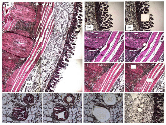 Formalin fixed-paraffin embedded specimens from each subject and control were sectioned at 10 µm and placed on 2.0 µm nuclease and human nucleic acid free polyethylene naphthalate (PEN) membrane slides (Leica Microsystems; Milano, Italy). After deparaffination and rehydration, sections were stained with hematoxylin and eosin (Merck KGaA, Darmstadt, Germany) for histological recognition of the different gut layers/cell types. Based on morphological criteria, each ileal layer (mucosa; submucosal small vessels deprived of any blood cells; circular muscle layer, myenteric plexus and longitudinal muscle layer) were microdissected (Figure 3) using Leica LMD 6 Laser Capture Microdissection system (Leica Microsystems; Milano, Italy) equipped by a Leica DFC7000 T camera. Microdissected sections were separately collected onto the caps of 0.2 mL PCR tubes (Merck KGaA, Darmstadt, Germany) and DNA were extracted on the same day of collection.
