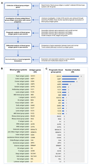 The flow diagram of this study. (A) The schematic diagram shows how the analysis route of the prognostic value of blood group antigen genes in pan-cancers was calculated. (B) The chart shows that 33 blood group antigen genes in 29 blood group systems were analyzed in this study. (C) The frequency of published records of blood group antigens as cancer prognostic markers.
