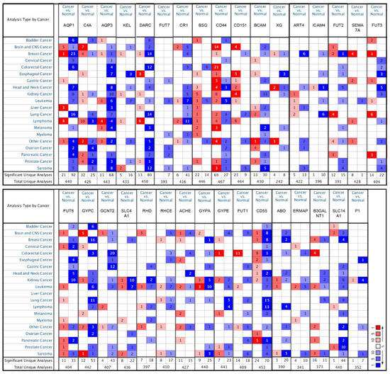 The differential expression of the blood group antigen system gene mRNA expression in pan-cancers. The threshold was set using following parameters: |log2(fold change)| ≥ 1 and p value < 0.05. The number in the cell represents the number of datasets that meets the thresholds. The color intensity (red or blue) is directly proportional to the significance level of upregulation or downregulation, respectively.