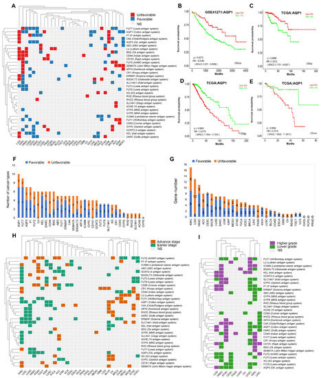 The relationship between the expression of blood group antigen system genes and prognostic clinical features in different types of cancers in TCGA dataset. Significant correlation is shown in color (p < 0.05). (A) Association between gene expression and overall survival across human cancers. Unsupervised hierarchical clustering and heatmap for the 33 blood group antigens across 30 cancers based on LOGpc results. Red represents unfavorable outcome (blue represents favorable), i.e., the gene is associated with shorter (or longer) survival. NS: Not Significant. (B–E) High AQP1 expression was related to good OS in LUCA and KIRP, to poor OS in LGG and UVM. (F) The number of cancer types with prognosis potency. (G) The number of each blood group gene in the prognosis of different cancer types. (H) Association between gene expression and cancer stage across human cancers. Earlier/Advance: the gene is associated with earlier/advance stage (Spearman correlation test: p < 0.05). NS: Not Significant. (I) Association between gene expression and tumor grade across human cancers. Lower/Higher: the gene is associated with lower/higher grade (Spearman correlation test: p < 0.05). NS: Not Significant. Cancer types: ACC (adrenocortical carcinoma), BLCA (bladder urothelial carcinoma), BRCA (breast invasive carcinoma), CESC (cervical squamous cell carcinoma and endocervical adenocarcinoma), CHOL (cholangiocarcinoma), COAD (colon adenocarcinoma), ESCA (esophageal carcinoma), GBM (glioblastoma multiforme), HNSC (head and neck squamous cell carcinoma), KICH (kidney chromophobe), KIRC (kidney renal clear cell carcinoma), KIRP (kidney renal papillary cell carcinoma), LGG (brain lower grade glioma), LIHC (liver hepatocellular carcinoma), LUAD (lung adenocarcinoma), LUSC (lung squamous cell carcinoma), MESO (mesothelioma), OV (ovarian serous cystadenocarcinoma), PAAD (pancreatic adenocarcinoma), PCPG (pheochromocytoma and paraganglioma), PRAD (prostate adenocarcinoma), READ (rectum adenocarcinoma), SARC (sarcoma), SKCM (skin cutaneous melanoma), STAD (stomach adenocarcinoma), TGCT (testicular germ cell tumors), THCA (thyroid carcinoma), UCEC (uterine corpus endometrial carcinoma), UCS (uterine carcinosarcoma), and UVM (uveal melanoma).