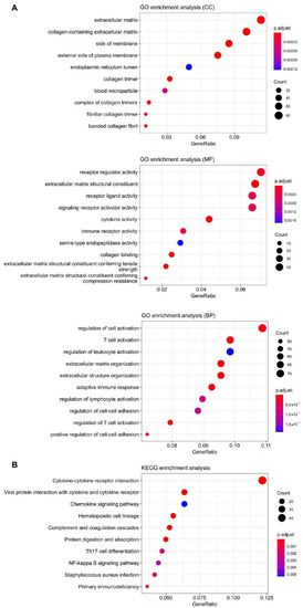 To further investigate the role of SEMA7A in tumors, the KIRC patients were divided into two subgroups according to the median expression level of SEMA7A, and functional enrichment of differential expression genes (DEGs) between the two subgroups was performed. The analysis results showed that the DEGs were mainly enriched in cellular components (CC) of the extracellular matrix, in the biological processes (BP) of regulated cellular activation, and in molecular functions (MF) of receptor regulator activity (Figure 5A). The pathway analysis results showed that the DEGs were mainly enriched in cytokine–cytokine receptor interactions, and the NF-kappa B signaling pathway (Figure 5B).